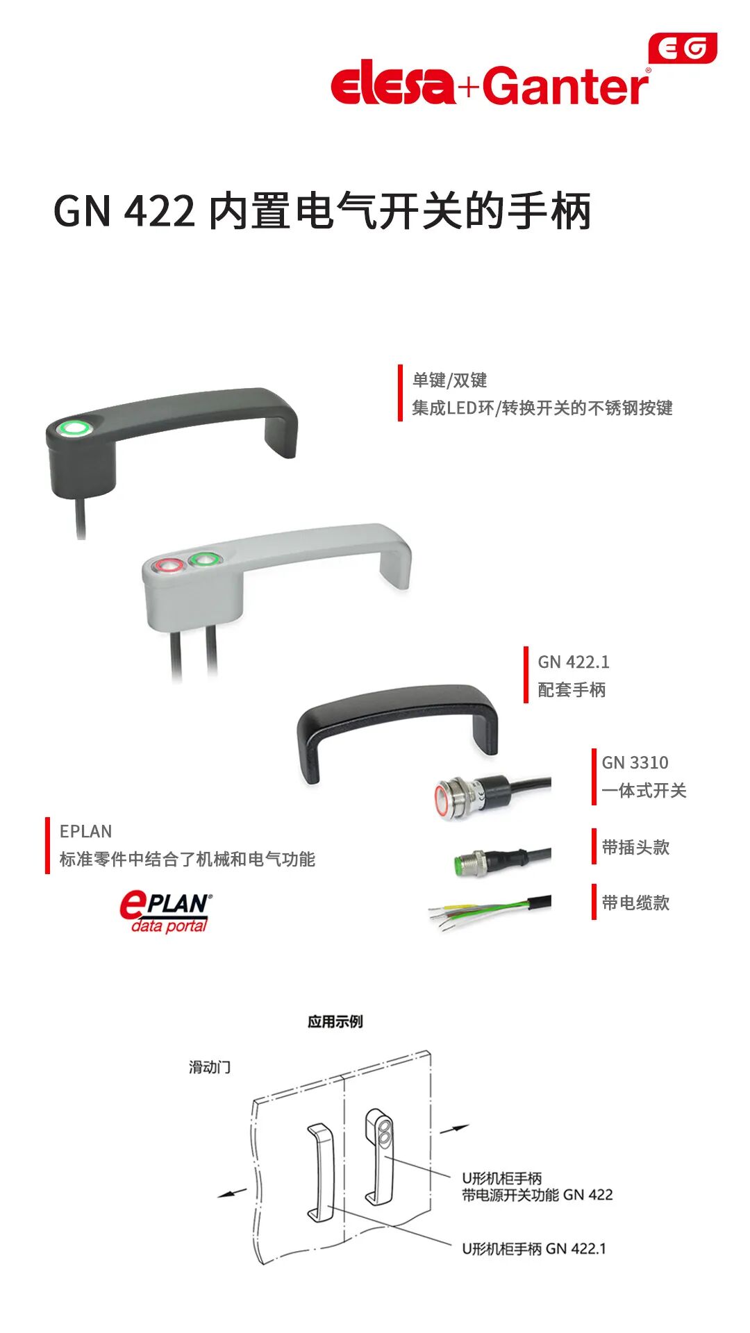 U形機柜手柄GN 422 也使用按鈕,但沒有緊急停止裝置。GN 3310開關以紅色或綠色發(fā)光按鈕的形式提供即時反饋。